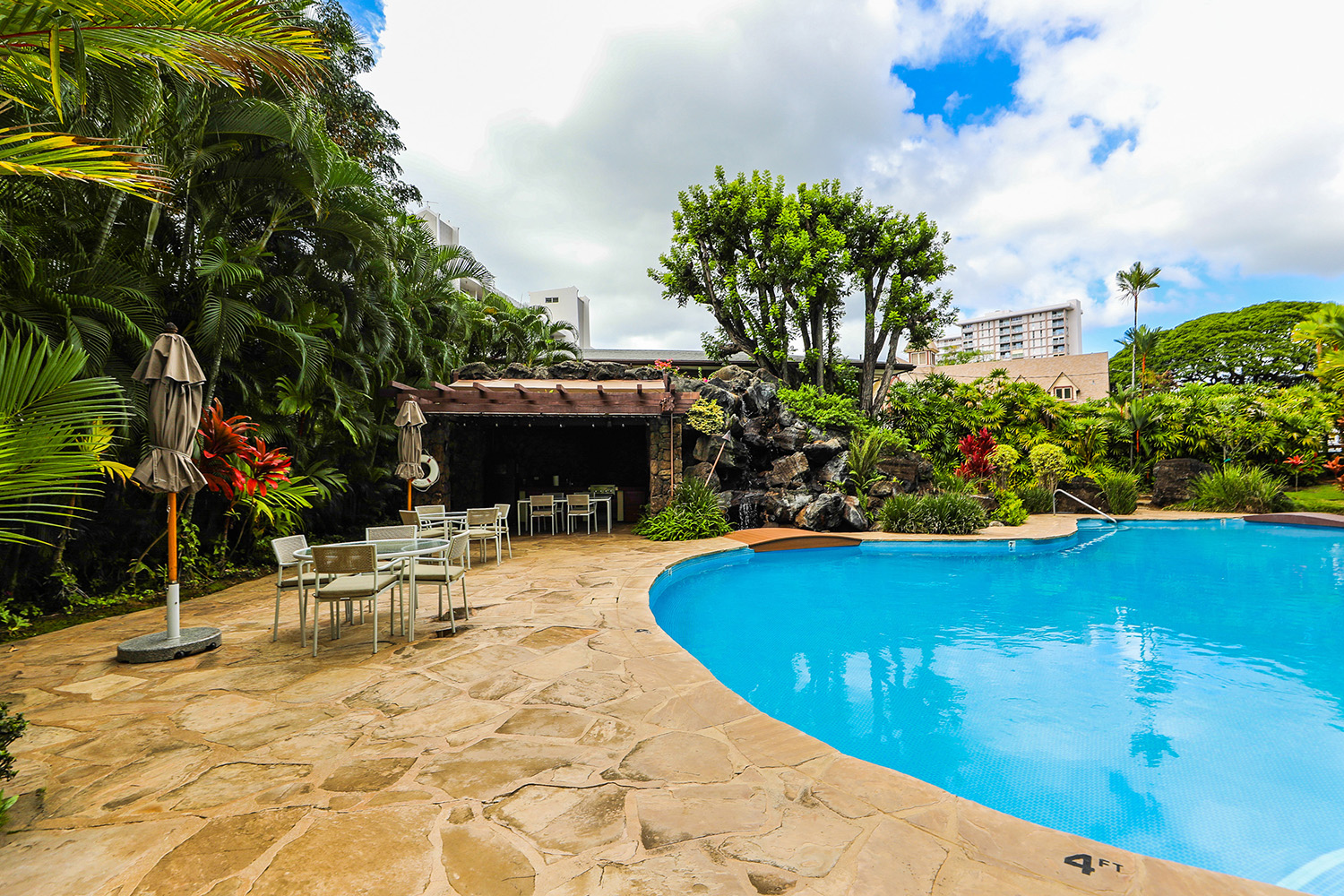 Affordable Luxury! Nestled amidst the serene Manoa stream , this spacious two-bedroom, two bath condominium offers a lifestyle of comfort far beyond its price. Elegant and secure, it seamlessly blends modern amenities with tranquil surroundings. Enjoy a fully equipped kitchen a relaxing spa, a pristine pool, a cabana and a private wine cellar. Delight in the warmth of wood accents with built in cabinets, flooring and seating. Plus , enjoy beautiful views of Manoa Valley, majestic trees and even a peekaboo view of Diamond Head. Additional perks include guest parking, two covered parking spaces and extra storage. This is an ideal retreat! Stop by on Sunday, January 11 between 2 and 5 pm!